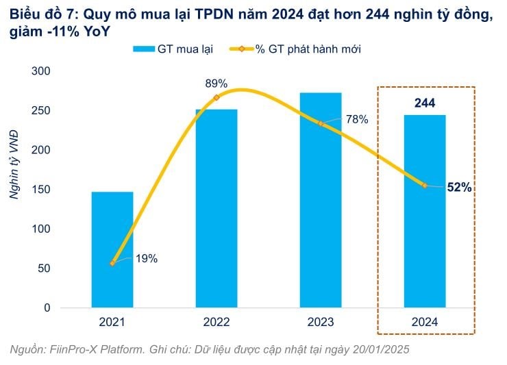 Về hoạt động mua lại, các tổ chức phát hành đã thực hiện mua lại trước hạn hơn 244 nghìn tỷ đồng TPDN trong năm 2024, giảm 11% so với năm 2023.