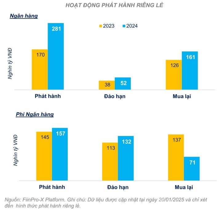 Ngược lại, các ngân hàng vẫn tích cực trong việc mua lại trái phiếu trước hạn như một phần nỗ lực giữ ổn định Hệ số an toàn vốn (CAR) với tổng giá trị mua lại năm 2024 đạt 173,4 nghìn tỷ, tăng 28% so với năm 2023.