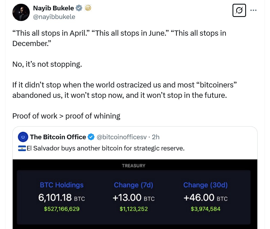 "Việc mua Bitcoin sẽ không dừng lại", vị Tổng thống viết trên X. "Trong qua khứ Bitcoin đã từng bị phản đối mạnh mẽ, quốc gia của tôi đã vượt qua giai đoạn đó, chúng tôi sẽ không bao giờ từ bỏ việc nắm giữ 'đồng vàng số' trong tương lai", ông Bukele nhấn mạnh.