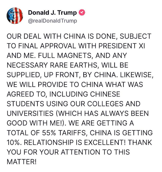 “CHÚNG TA NHẬN 55% THUẾ QUAN, TRUNG QUỐC CHỈ 10%”, vị Tổng thống Mỹ viết, đồng thời gọi đây là “một CHIẾN THẮNG lớn cho cả hai cường quốc”.