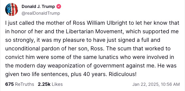 Ông Trump ân xá cho 'cha đẻ' Silk Road (Nguồn: X)