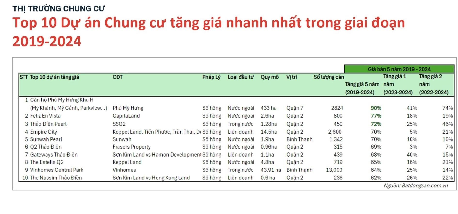 Theo dữ liệu tổng hợp của Batdongsan.com.vn, top 10 dự án chung cư TP.HCM tăng giá cao nhất và bền vững nhất trong suốt 5 năm vừa qua giai đoạn 2019-2024 gồm căn hộ Phú Mỹ Hưng khu H (Mỹ Khánh, Mỹ Cảnh, Parkview...), Feliz En Vista, Thảo Điền Pearl, Empire City, Sunwah Pearl, Q2 Thảo Điền, Gateways Thảo Điền, The Estella Q2, Vinhomes Central Park, The Nassim Thảo Điền.