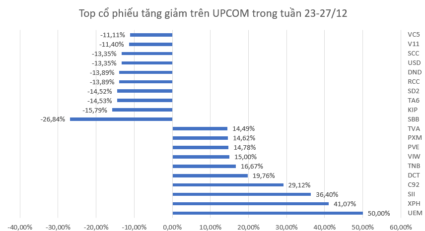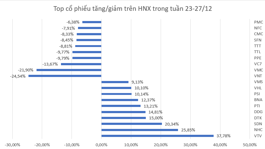 Trong tuần 23-27/12, sàn HNX ghi nhận tới 3 mã có mức tăng trên 20%.
