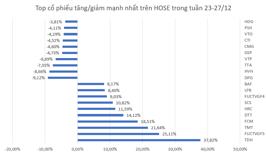 Trong đó, TDH của CTCP Phát triển Nhà Thủ Đức (Nhà Thủ Đức) là mã có hiệu suất cao nhất sàn HOSE với mức tăng 37,82% sau 5 phiên giao dịch. Trong tuần, mã này tím trần 4 phiên liên tiếp từ 23-26/12. Riêng phiên cuối tuần 27/12, thanh khoản khớp lệnh của cổ phiếu TDH đạt hơn 4 triệu đơn vị, cao nhất trong hơn 1 năm trở lại.