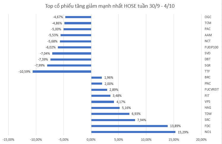 Ở hướng ngược lại, TTF là mã duy nhất giảm hơn 10%, kết tuần ở mức 3.040 đồng/cp, giảm 10,59% so với cuối tuần trước.