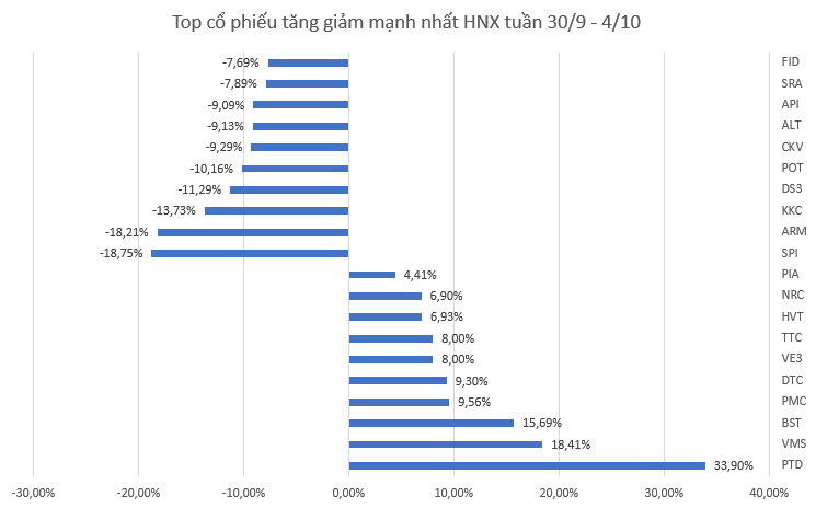 Trên sàn HNX, PTD là mã cổ phiếu có hiệu suất ấn tượng khi nhất khi tăng 33,9% so với cuối tuần trước. Dù vậy, thanh khoản của mã này rất thấp với khối lượng giao dịch chỉ đạt vài trăm đơn vị mỗi phiên.