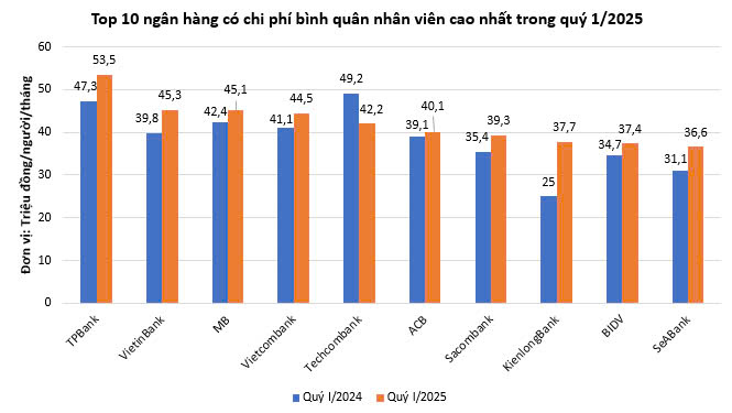 Theo dữ liệu từ báo cáo tài chính hợp nhất của 27 ngân hàng niêm yết, chi phí bình quân cho mỗi nhân viên ngành ngân hàng trong quý 1/2025 đạt 33 triệu đồng/tháng, tăng 7,5% so với cùng kỳ năm trước. Con số này cao gấp 3,5 lần thu nhập trung bình của người lao động Việt Nam (9,4 triệu đồng/tháng), bao gồm các khoản lương, thưởng, phụ cấp và chi phí liên quan khác.