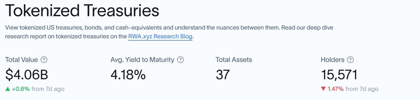 Theo dữ liệu từ RWA.xyz, sản phẩm của các dự án đều đạt mức lãi suất trung bình (APY) 4,18%, với tổng cộng 15.571 người cùng đầu tư vào 37 quỹ “tokenized Treasury” gần như gấp đôi so với 8.754 nhà đầu tư chỉ hơn 3 tháng trước.