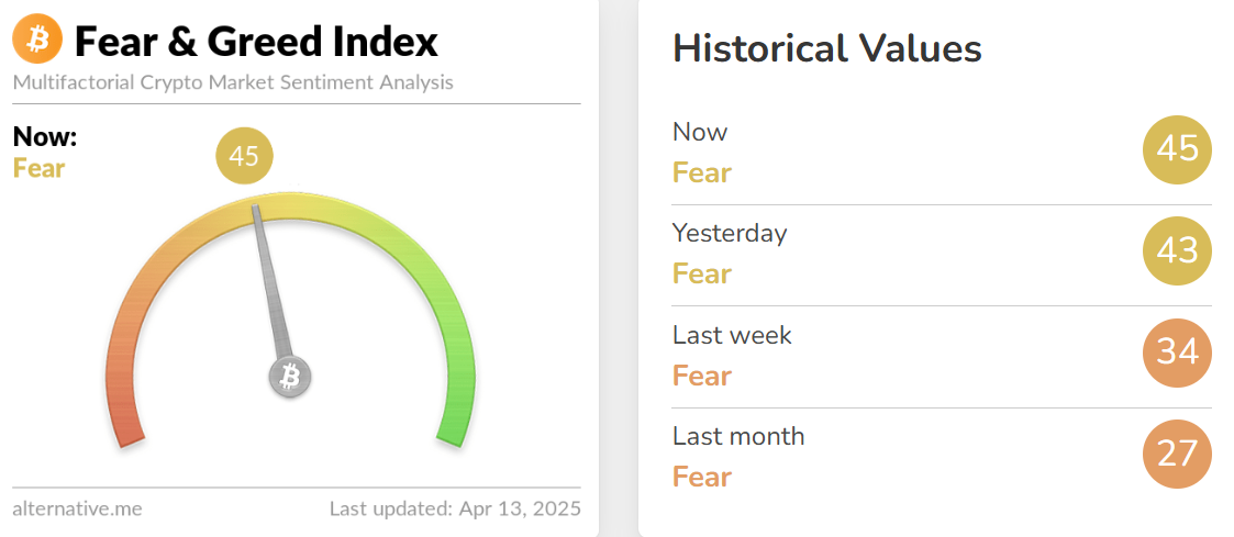 Tâm lý nhà đầu tư được cải thiện rõ rệt, chỉ số Tham lam và Sợ hãi tăng vọt lên 45 điểm (Nguồn: alternative.me)