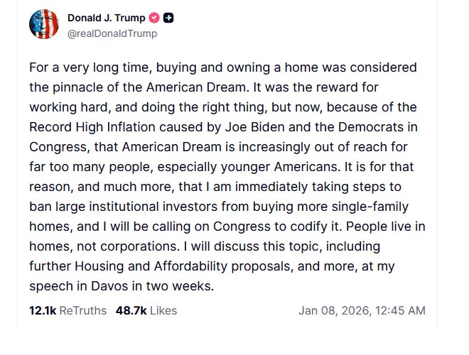 Trong bài đăng trên mạng xã hội Truth Social hôm 7/1, ông Trump nói sẽ nhanh chóng triển khai các bước cần thiết để ngăn doanh nghiệp Phố Wall mua gom nhà ở rồi cho thuê lại, đồng thời kêu gọi Quốc hội sớm luật hóa quy định này.