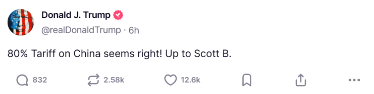 "Thuế quan 80% đối với Trung Quốc có vẻ hợp lý! Tùy Scott Bessent quyết định", Tổng thống Trump chia sẻ trên mạng xã hội Truth Social.