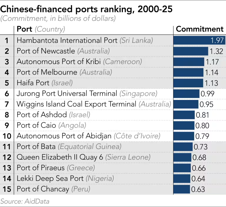 Trung Quốc đã cung cấp 23,9 tỷ USD dưới dạng viện trợ và các cam kết cho vay để phát triển 168 cảng biển tại 90 quốc gia trong giai đoạn từ năm 2000 đến 2025, theo báo cáo của AidData (Mỹ).