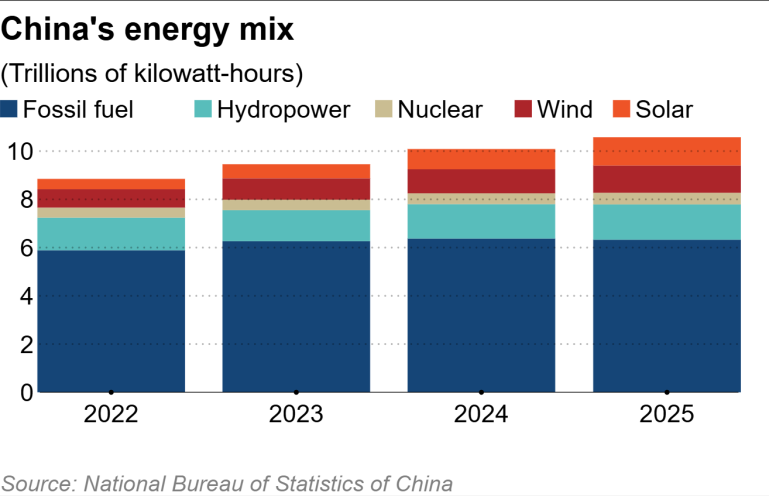 Theo Cục Thống kê Quốc gia Trung Quốc, tổng sản lượng điện của Trung Quốc trong năm 2025 đạt khoảng 10.000 tỷ kWh, tăng 5% so với năm trước.