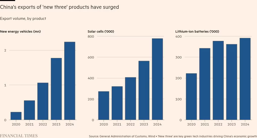Xuất khẩu 3 nhóm ngành xe EV - tấm pin mặt trời - pin lithium-ion tăng vọt trong giai đoạn 2020-2024 (Nguồn: Financial Times)