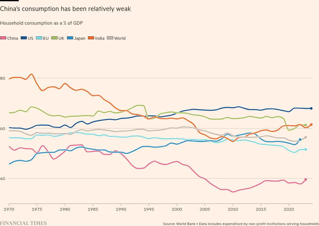 Tiêu dùng của Trung Quốc vẫn còn yếu so với các nền kinh tế lớn khác. Theo Ngân hàng Thế giới, tiêu dùng hộ gia đình của Trung Quốc chỉ chiếm khoảng 40% GDP, thấp hơn đáng kể so với 68% tại Mỹ và trên 60% tại châu Âu.