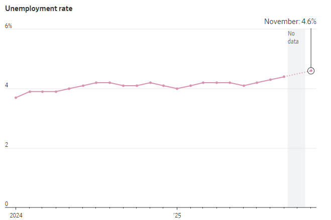 Đáng chú ý, tỷ lệ thất nghiệp tháng 11 đã tăng từ mức 4,4% của tháng 9 – thời điểm gần nhất Bộ Lao động Mỹ công bố số liệu – lên 4,6%. Riêng tháng 10 không có số liệu thất nghiệp, bởi trong thời gian đóng cửa Chính phủ kéo dài 43 ngày của Mỹ, các cơ quan chức năng không thể tiến hành khảo sát cần thiết để tính toán chỉ số này.
