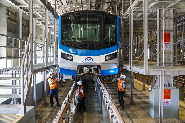 Công nhân, kỹ sư tham gia bảo dưỡng đoàn tàu của tuyến metro số 1 TPHCM. Ảnh: Duy Anh