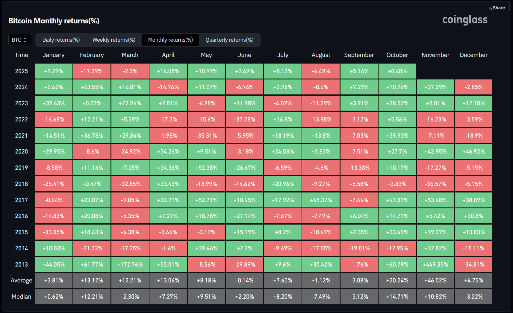 Lịch sử tăng giá BTC trong tháng 10 (Nguồn: Coinglass)