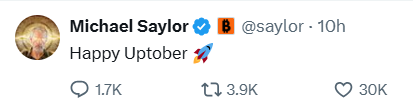 Năm nay, tỷ phú Michael Saylor – Chủ tịch Strategy – một lần nữa hâm nóng khái niệm này với lời chúc “Happy Uptober 🚀”, đúng vào lúc BTC vượt ngưỡng 116.000 USD.