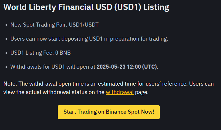 Binance sẽ niêm yết World Liberty Financial USD (USD1) và bắt đầu giao dịch spot vào lúc 19:00 hôm nay 22/05, theo giờ Việt Nam.