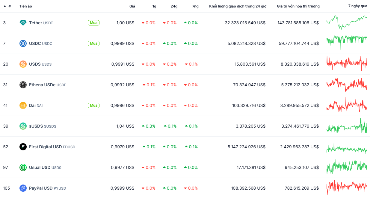 Top các đồng stablecoin có vốn hóa lớn nhất thị trường (Nguồn: CoinGecko)