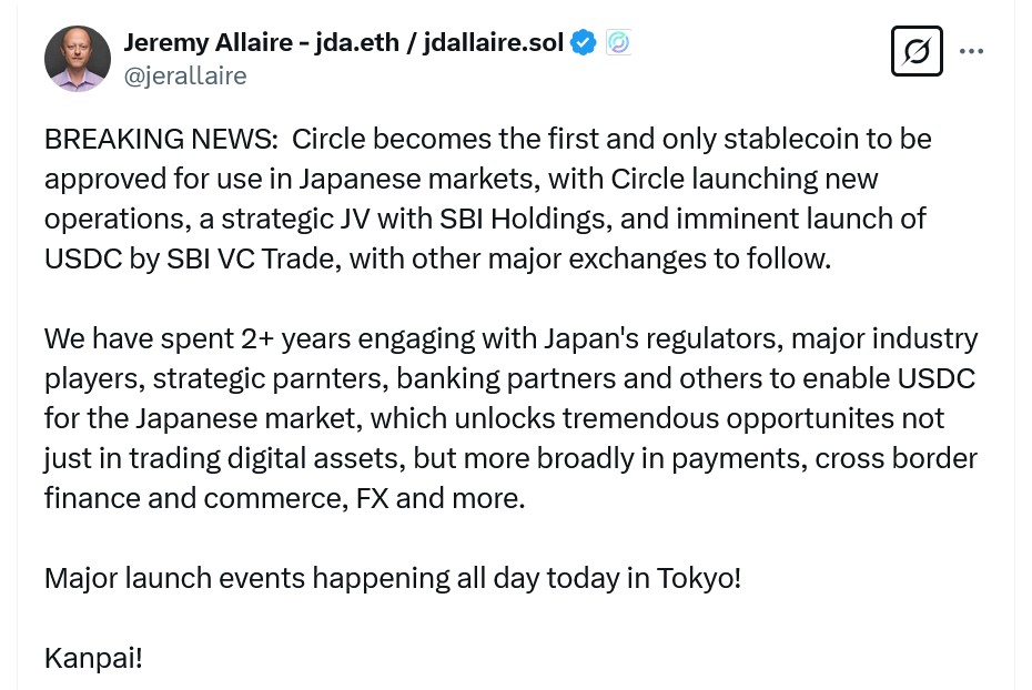 Đây không chỉ là tin vui cho giới đầu tư crypto mà còn đánh dấu 2 năm đàm phán căng thẳng giữa Circle với các cơ quan quản lý và ngân hàng Nhật Bản. CEO Circle Jeremy Allaire khẳng định đây là cột mốc quan trọng, mở ra cơ hội lớn trong giao dịch tài sản số, thanh toán xuyên biên giới và thương mại quốc tế.