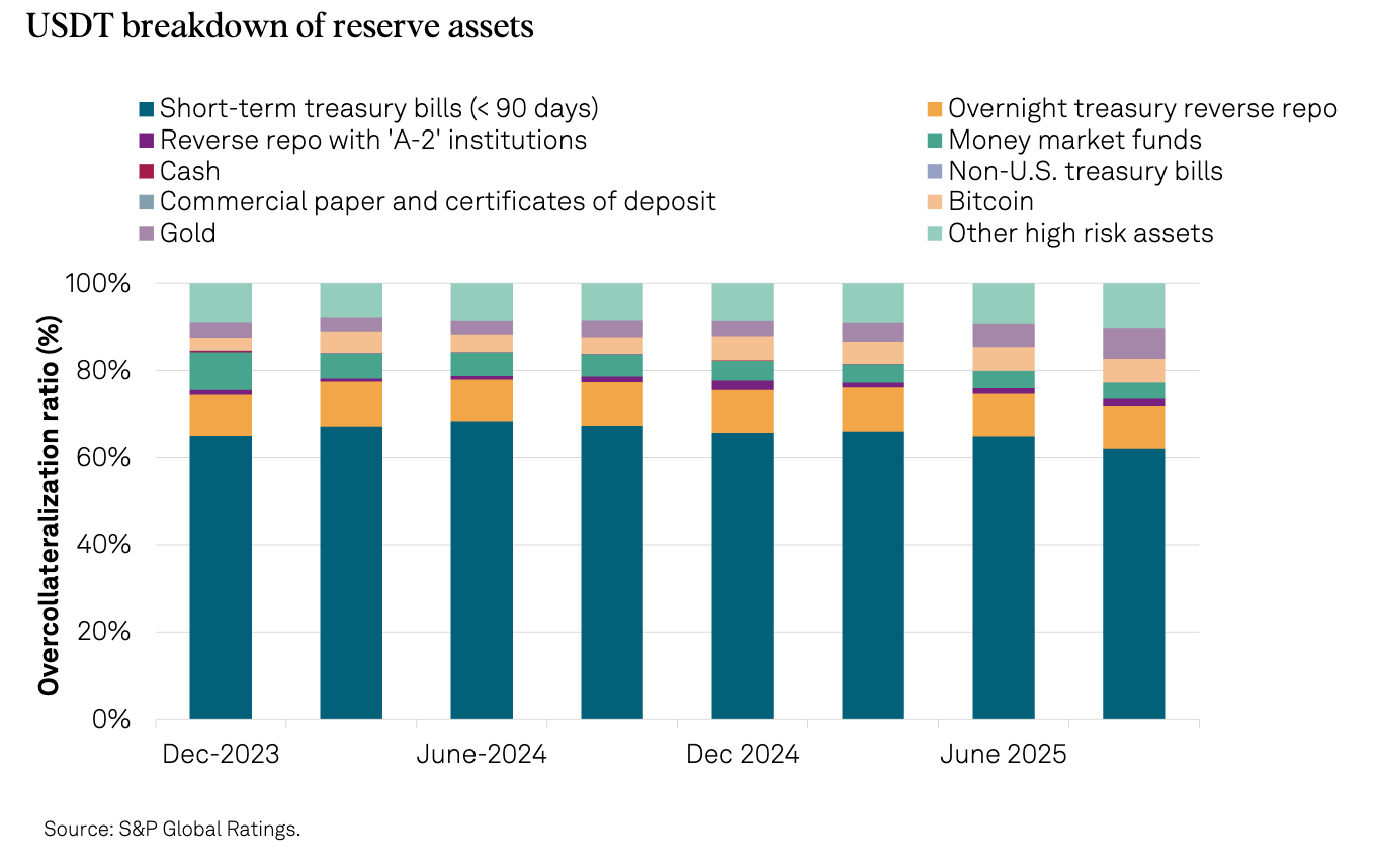 Theo S&P, đánh giá trên xuất phát từ nhiều yếu tố, trong đó có việc Tether dùng các tài sản rủi ro lớn để bảo chứng cho USDT, bao gồm: Bitcoin, vàng, các khoản cho vay và trái phiếu doanh nghiệp.