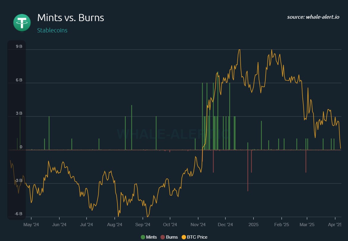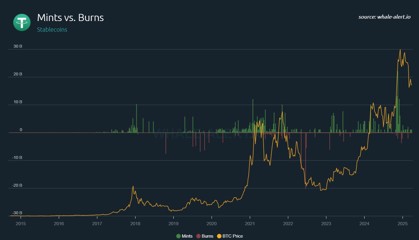 Theo dữ liệu từ Whale Alert, khi biểu đồ hóa lượng USDT được phát hành và đốt so với đường giá BTC từ năm 2015 đến đầu 2025, có thể thấy mối tương quan rõ ràng giữa hai biến động này.