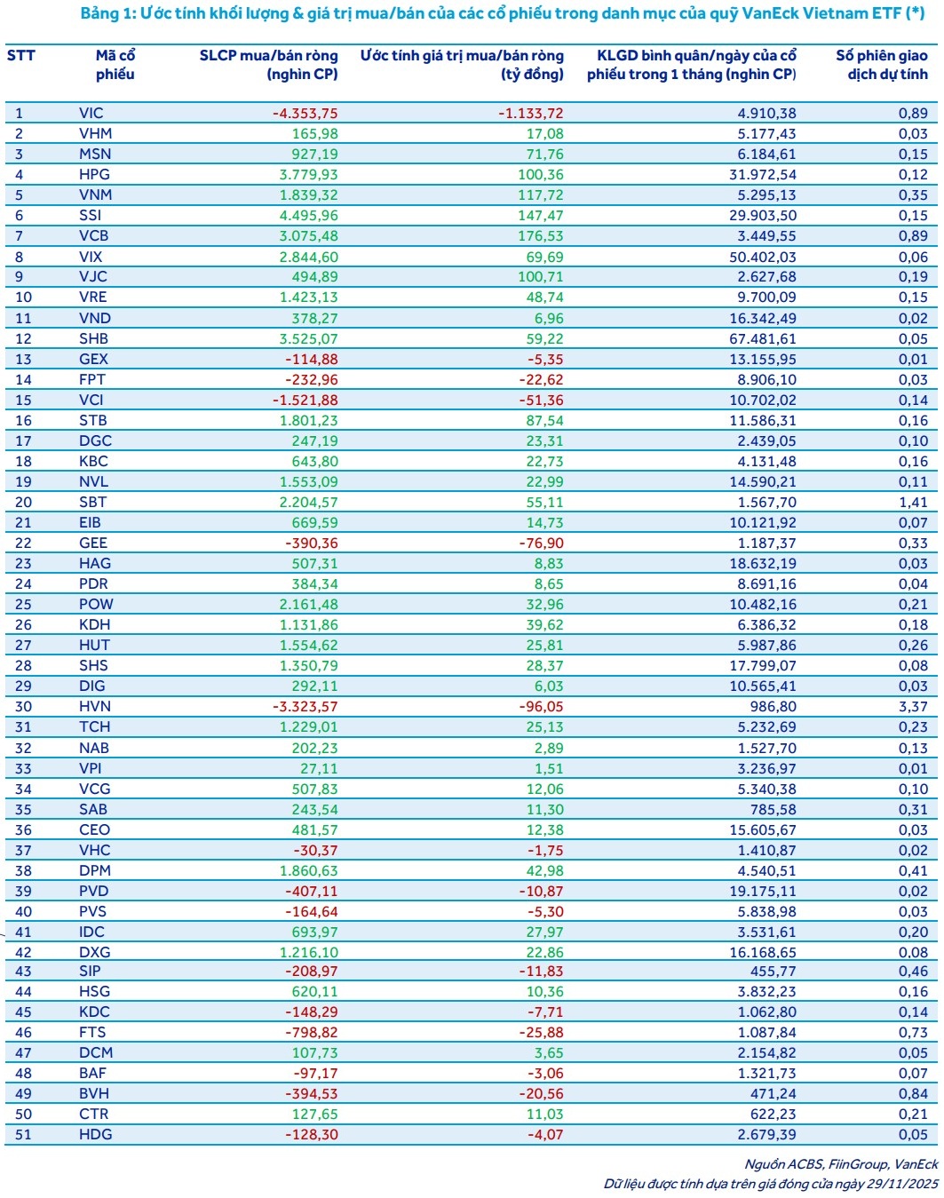 Quỹ VanEck Vietnam ETF dự kiến sẽ cơ cấu danh mục với quy mô gần 3.000 tỷ đồng (cả mua và bán) trong kỳ điều chỉnh quý 4/2025, theo dự báo của ACBS. Danh mục mô phỏng theo chỉ số Vietnam Local Index sẽ được công bố ngày 12/12 và có hiệu lực từ ngày 19/12/2025.