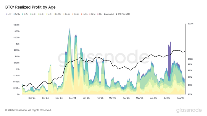 Dữ liệu on-chain từ Glassnode cho thấy nhà đầu tư nắm giữ dài hạn (LTH) đã chốt lời quyết liệt. Riêng tháng 7, lợi nhuận hiện thực hóa của nhóm này vượt 1 tỷ USD mỗi ngày (trung bình 7 ngày) – một trong những pha phân phối lớn nhất lịch sử.