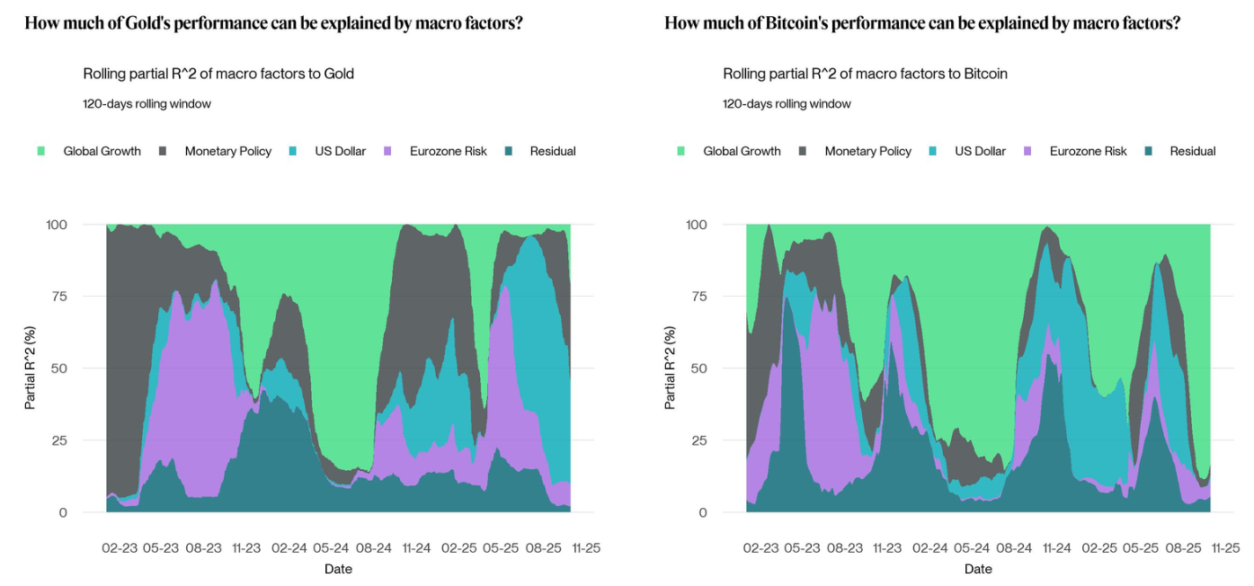 Đo lường ảnh hưởng của các biến số vĩ mô lên BTC và Vàng (Nguồn: BitWise)