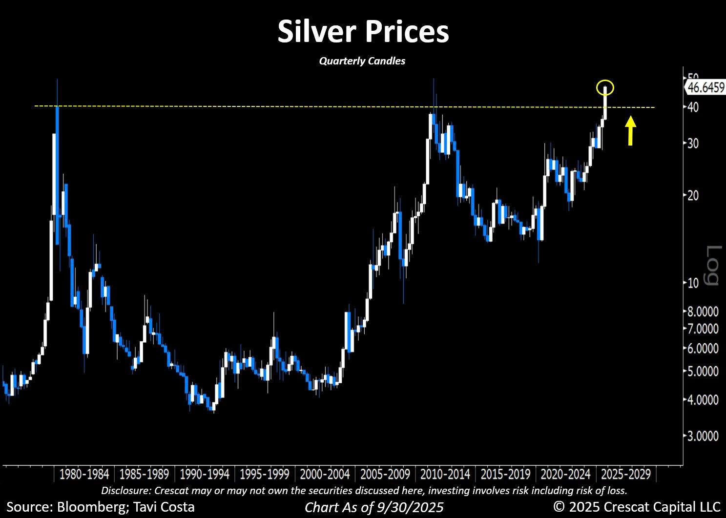 Bạc vừa kết thúc một quý cực kỳ ấn tượng với mức tăng +29%, đóng cửa ngay tại ngưỡng kháng cự ngang quan trọng của mô hình cốc và tay cầm khổng lồ kéo dài hàng thập kỷ. Đây không chỉ là một diễn biến kỹ thuật, mà còn là tuyên bố sức mạnh từ phe mua, phản ánh niềm tin và sự tích lũy bền bỉ hướng tới một cú đột phá quyết định. Một cú breakout xác nhận trên vùng kháng cự này có thể kích hoạt sóng tăng dài hạn mới, mở ra khả năng thị trường hướng về các mốc lịch sử (trên 50 USD).