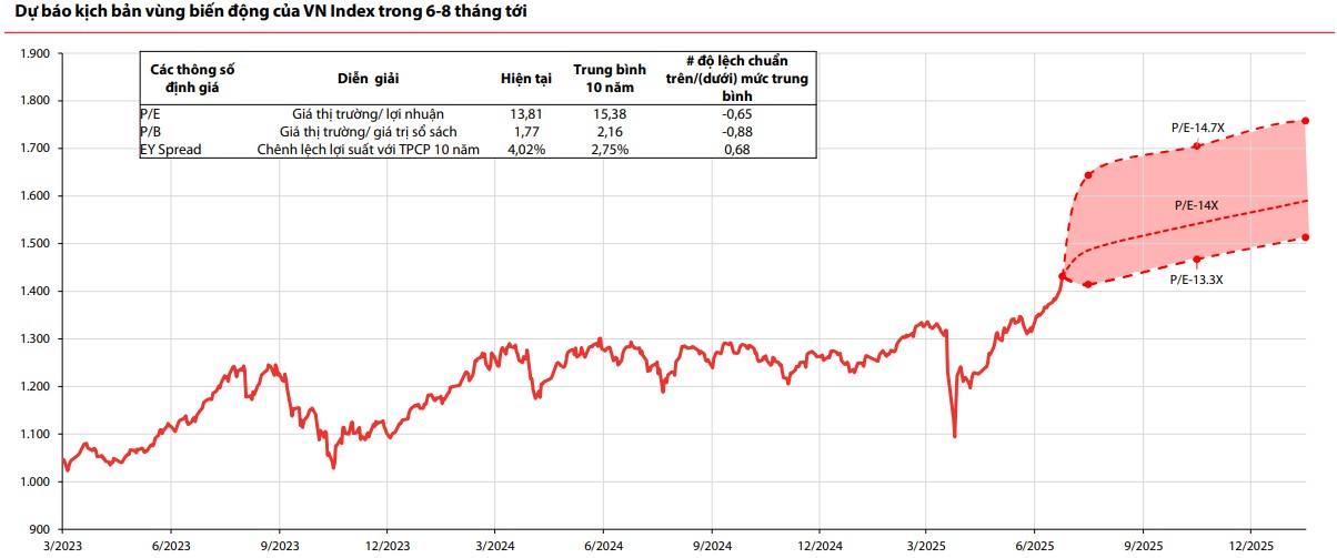 "VN-Index có thể hướng đến vùng 1.513 – 1.756 trong vòng 6–8 tháng tới, tương đương mức tăng 6%–23% so với mức đóng cửa ngày 9/7/2025", theo CTCP Chứng khoán Rồng Việt (VDSC).