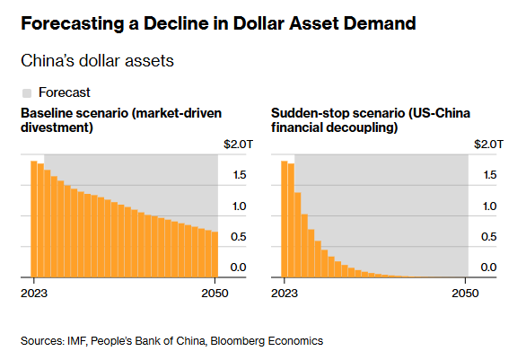 Trung Quốc thì khác, đất nước này chắc chắn sẽ giảm lượng dự trữ USD xuống mức thấp hơn nữa. Các nhà phân tích của Bloomberg và IMF đưa ra 2 kịch bản đối với trường hợp này: