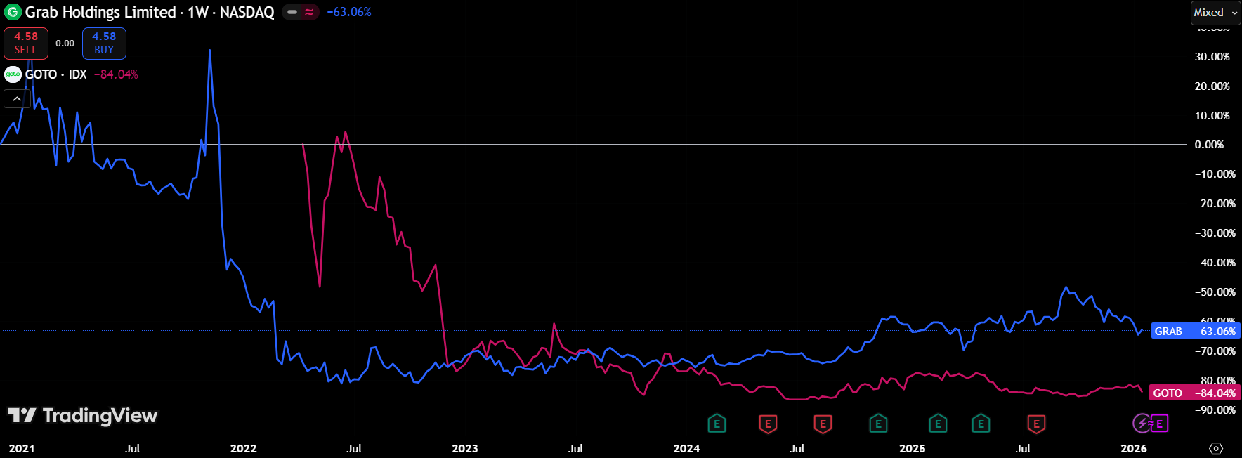 Diễn biến giá cổ phiếu Grab và Goto (Nguồn: TradingView)