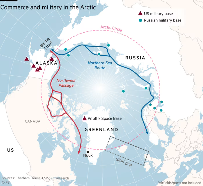Các tuyến phòng ngự quân sự của Nga và Mỹ quanh Bắc Cực và Greenland (Ảnh: Financial Times)