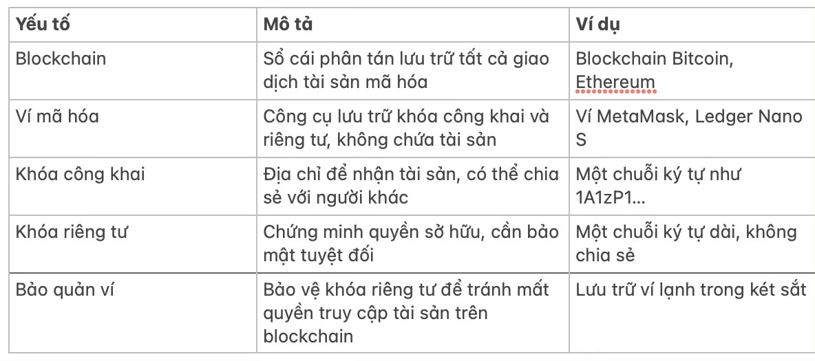 Tài sản mã hóa luôn nằm trên blockchain, ví chỉ là công cụ chứa khóa để truy cập, và bảo quản ví là bảo vệ khóa riêng tư, đảm bảo quyền kiểm soát tài sản.