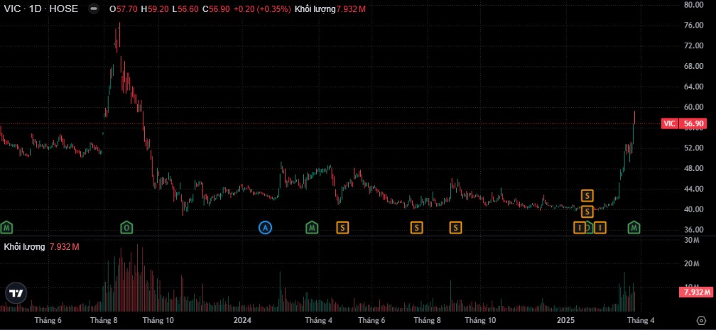 Tính từ đầu tháng 3/2025 đến nay, cổ phiếu VIC nhà tỷ phú Phạm Nhật Vượng đã tăng 37,7%, đạt mức cao nhất kể từ tháng 9/2023.