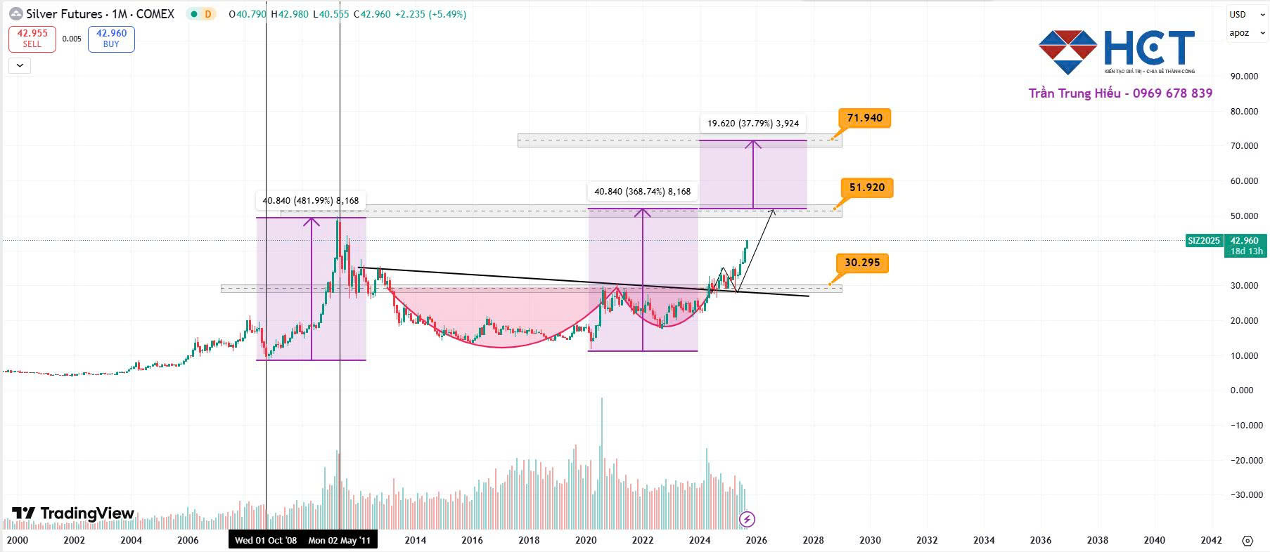 - Thời điểm hiện tại: Bạc cũng đã tích lũy lâu quanh 20–26 USD và đang tăng mạnh