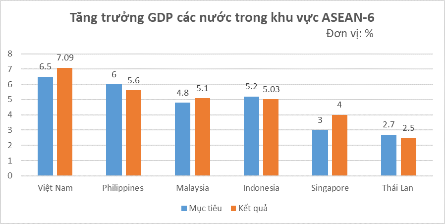Tính chung cả năm, GDP tăng 7,09% so với năm trước, vượt mục tiêu đề ra (6,5-7%). Trong đó, Khu vực nông, lâm nghiệp và thủy sản tăng 3,27%; khu vực công nghiệp và xây dựng tăng 8,24%; khu vực dịch vụ tăng 7,38%.