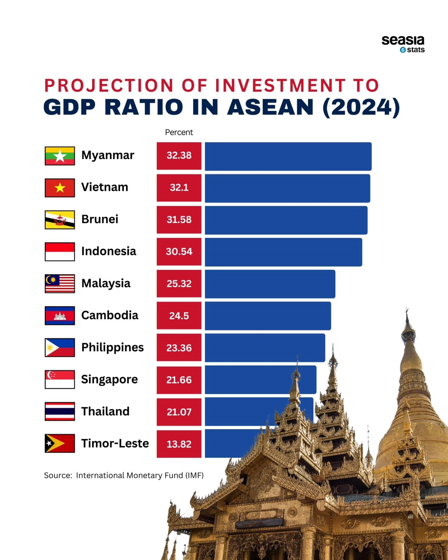 Mới đây, trang đồ hoạ thống kê Seasia Stats (của Indonesia) đã chia sẻ đồ hoạ tỷ lệ đầu tư trên GDP dự kiến tại các nước Đông Nam Á trong năm 2024, dựa trên dữ liệu từ Quỹ Tiền tệ Quốc tế (IMF).