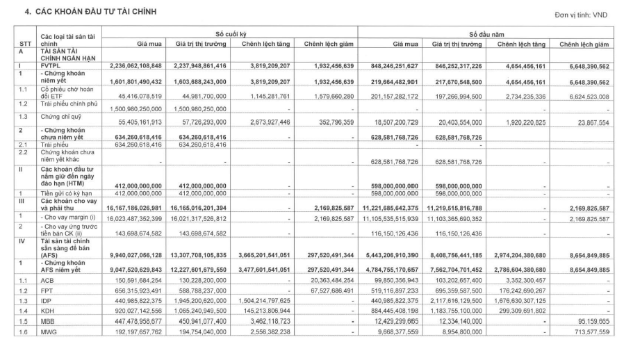 Giá trị danh mục FVTPL tại thời điểm cuối năm đạt 2.237,9 tỷ đồng, gấp đôi so với quý trước, do gia tăng tỷ trọng trái phiếu. Bên cạnh đó, giá trị các khoản đầu tư nắm giữ đến ngày đáo hạn (HTM) tăng 37%, lên 412 tỷ đồng.
