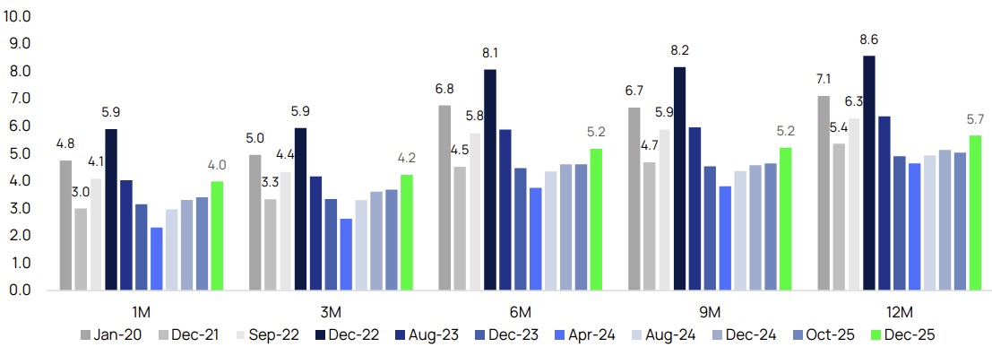 Đồng thời, Vietcap cho rằng NHNN nhiều khả năng sẽ tiếp tục duy trì lập trường chính sách tiền tệ nới lỏng nhằm hỗ trợ mục tiêu tăng trưởng, trong khi các căng thẳng thanh khoản mang tính thời điểm dự kiến sẽ hạ nhiệt dần sau giai đoạn cao điểm cuối năm.
