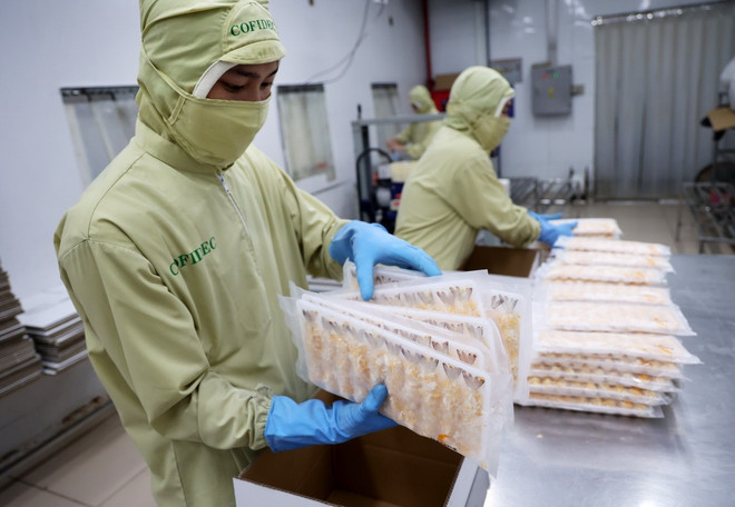 Đóng gói sản phẩm tôm chế biến xuất khẩu đi Nhật Bản. (Ảnh: Hồng Đạt/TTXVN)