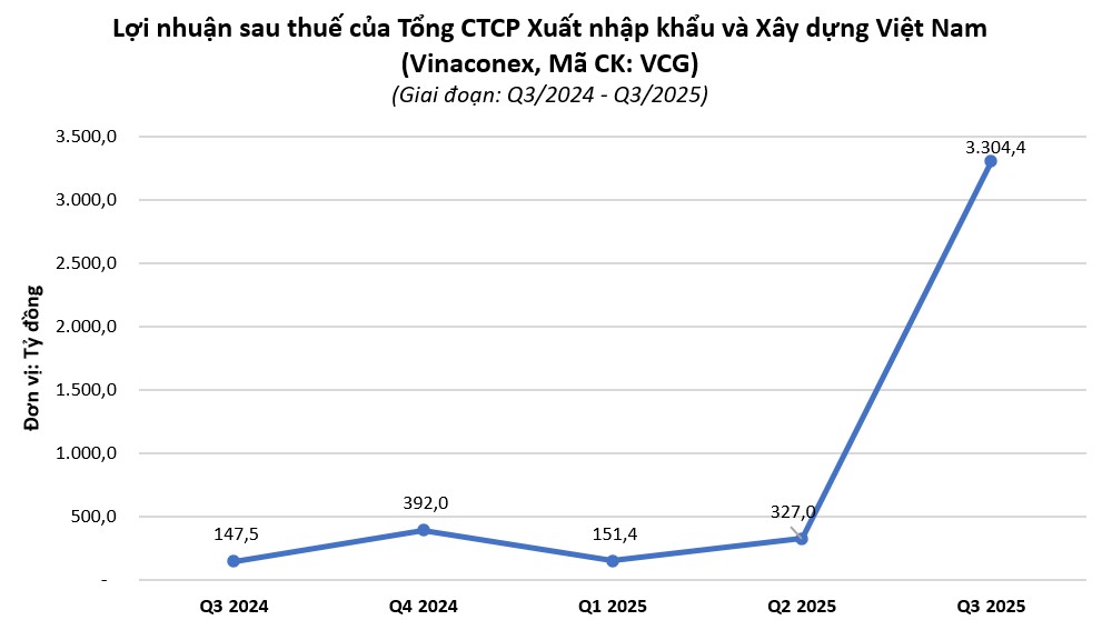 Kết thúc quý 3/2025, Tổng CTCP Xuất nhập khẩu và Xây dựng Việt Nam (Vinaconex, mã CK: VCG) báo lãi sau thuế 3.304,4 tỷ đồng, tăng gấp 22,4 lần so với cùng kỳ năm trước. Lũy kế 9 tháng đầu năm 2025, lợi nhuận sau thuế của công ty đạt 3.782,8 tỷ đồng, tăng gấp 4,9 lần so với cùng kỳ năm 2024.