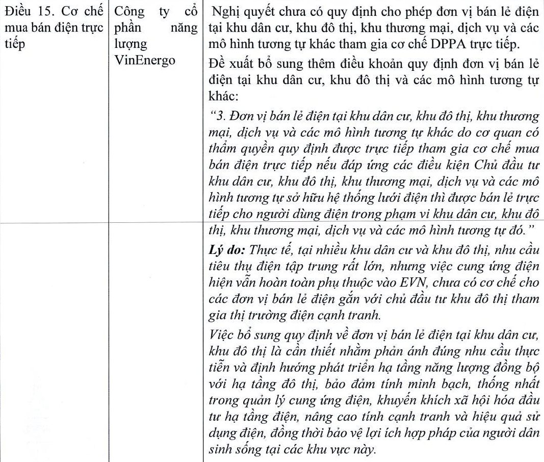 Do đó, VinEnergo cho rằng cần bổ sung quy định về đơn vị bán lẻ điện tại khu dân cư, khu đô thị để phản ánh đúng nhu cầu thực tế, đồng thời khuyến khích xã hội hóa đầu tư hạ tầng điện, nâng cao hiệu quả sử dụng năng lượng và bảo đảm quyền lợi của người dân.