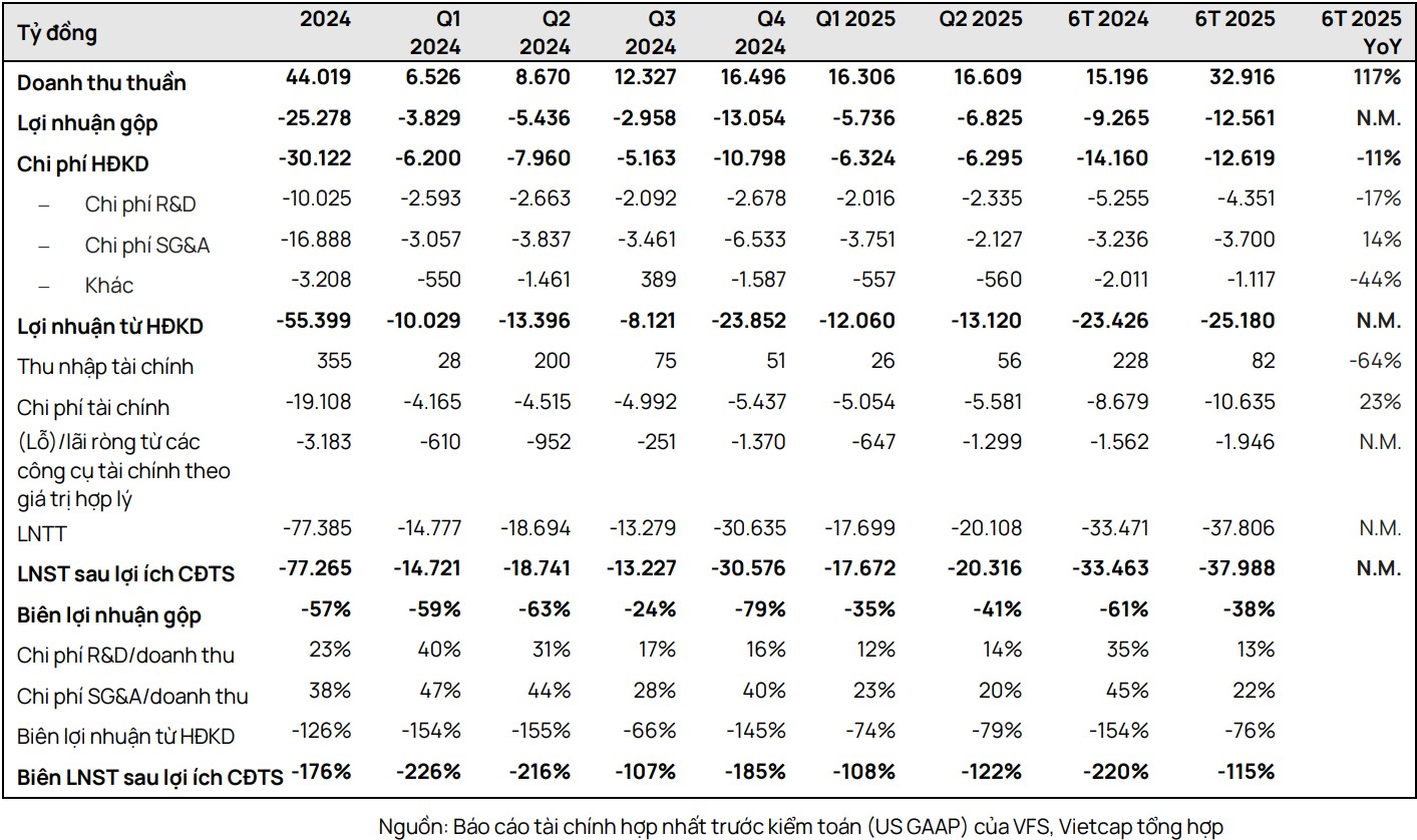 Trong nửa đầu năm 2025, doanh thu của VinFast đạt 32.900 tỷ đồng (tăng 117% so với cùng kỳ năm trước) và lỗ ròng ở mức 38.000 tỷ đồng (so với lỗ 33.500 tỷ đồng trong nửa đầu năm 2024).