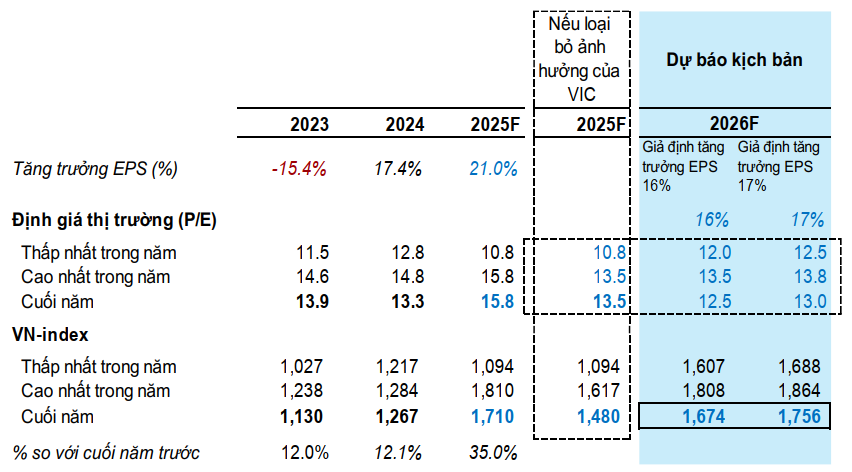 MBS cho biết, nếu loại bỏ ảnh hưởng của VIC, P/E hiện tại của VN-Index chỉ còn khoảng 13,5 lần, trong khi mức P/E trung bình của năm 2025 ở khoảng 12,2 lần. Cho thấy, động lực tăng trưởng trong thời gian tới sẽ phụ thuộc nhiều hơn vào tăng trưởng lợi nhuận thực chất, thay vì chỉ dựa vào hiệu ứng nâng định giá (re-rating).