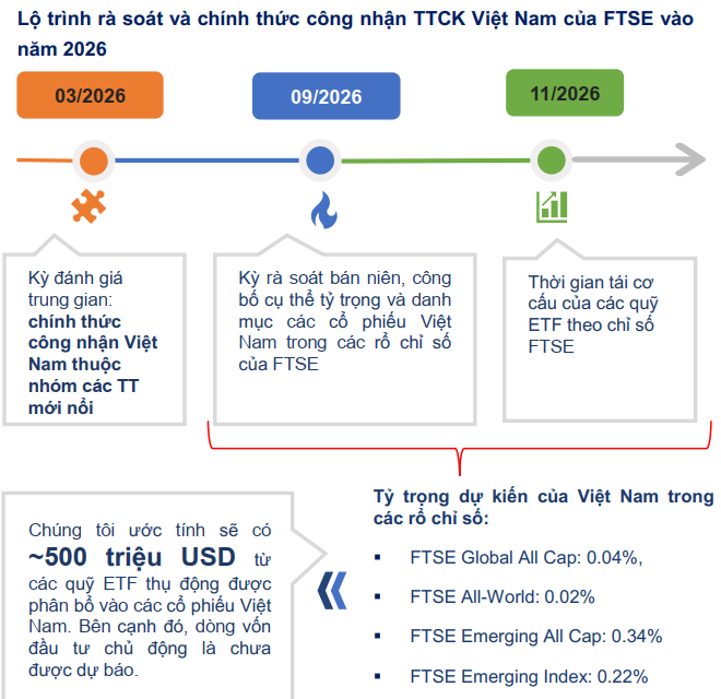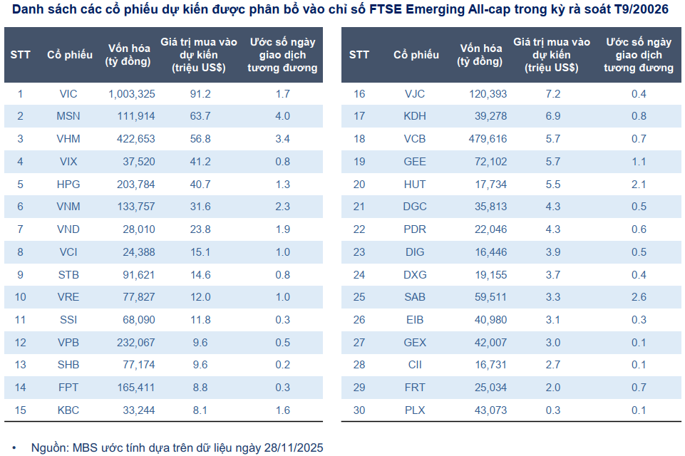 Ước tính của MBS cho thấy, Việt Nam có thể chiếm khoảng 0,34% tỷ trọng trong rổ FTSE Emerging All-cap và khoảng 0,22% trong FTSE Emerging Index, qua đó thu hút khoảng 500 triệu USD từ các quỹ ETF thụ động trong giai đoạn tái cơ cấu danh mục.