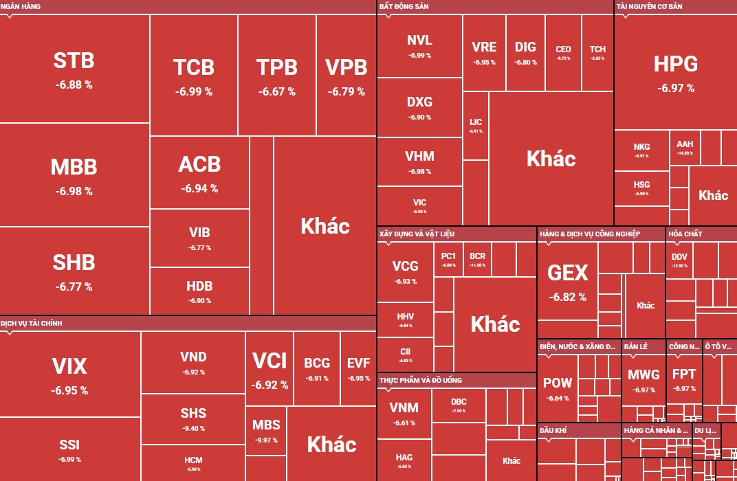 Chưa bao giờ thị trường chứng khoán Việt Nam có phiên giảm sâu như vậy. Chỉ số VN-Index bốc hơi gần 90 điểm, toàn thị trường có hơn 1.080 mã giảm, trong đó 450 mã kịch sàn.